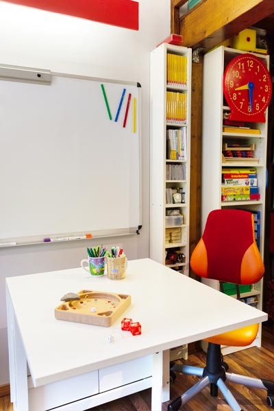 In der Villa Stolperstein wird intensiv mit bewährten, mit selbst angefertigten sowie mit modernsten Therapie- und Schulmaterialien oder Spielen gearbeitet: Die alte Schiefertafel, das moderne Whiteboard, edle Holzspiele (z. B. Domino, Mikado), das Notebook, iPad, und das Smartphone sowie der persönliche Kontakt über Skype nach Hause - es ist einfach alles Gute vorhanden, um Stolpersteine [0] erfolgreich zu beseitigen.